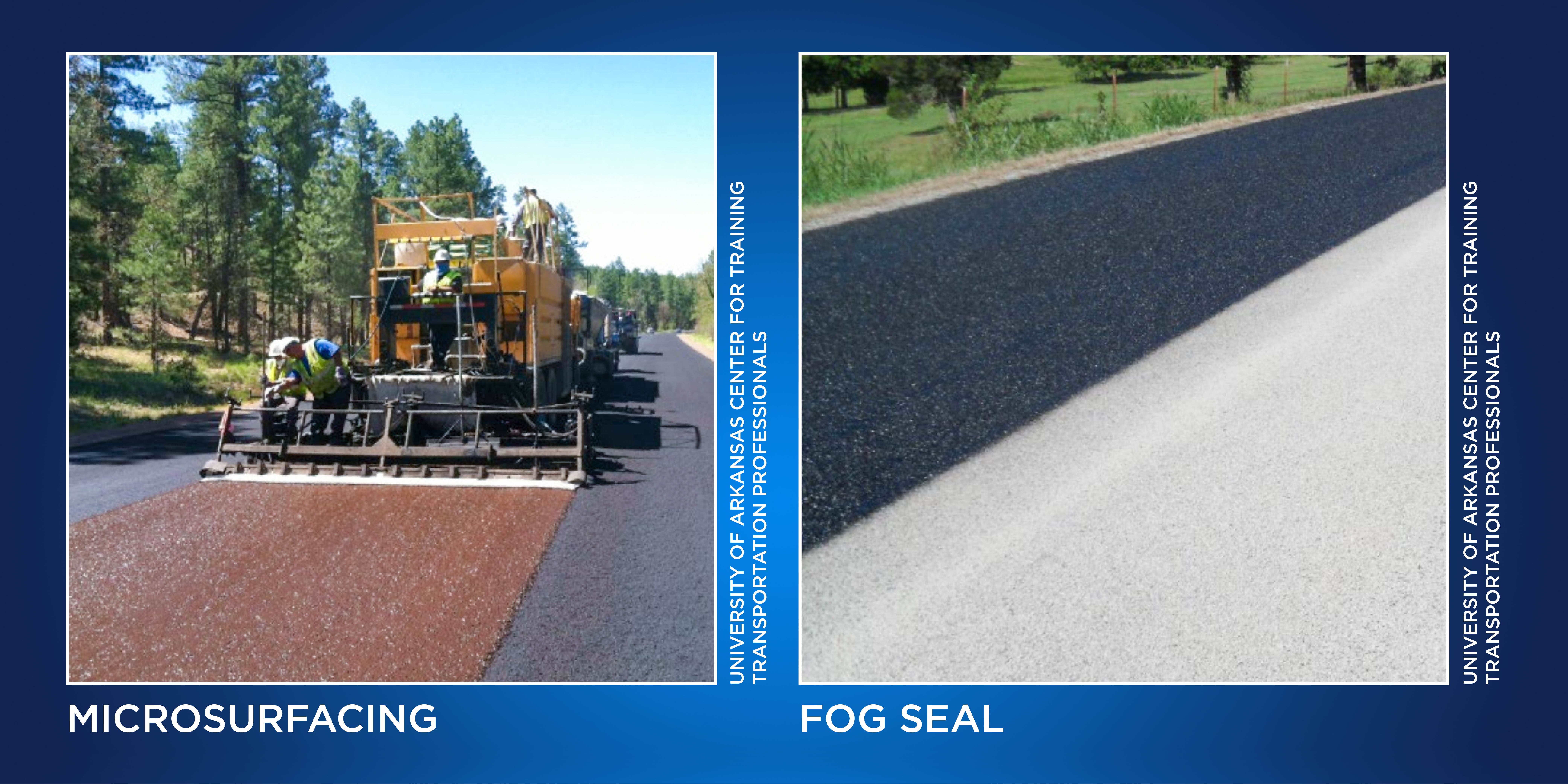 Fog seal: A fog seal application is similar to the micro seal or microsurfacing technique. It incorporates smaller asphalt chips—a grittier type of aggregate. It can be applied to any type of roadway to improve the wearing surface.