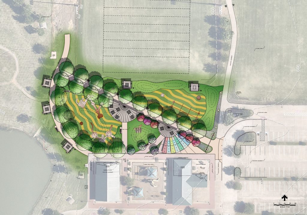 Old Celina Park is a one-acre all-inclusive, all-abilities playground designed with “play” in mind.  Explorers strolling through the stone gateway are drawn into the site by a multi-purpose spray fountain plaza with jumping fountains and lights, centered around two custom designed shade pavilions. The two pavilions resemble a windmill and grain silo, which is inspired by the surrounding farming community.