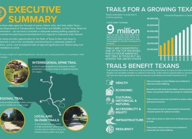 Trails have long been a part of Texas’ history. A burgeoning population has fueled Texans’ interest in developing trails across the State. The Texas Trails Study is an unusual, one-of-a-kind planning effort, purposefully intended to make a case for how the State of Texas, through its key agencies, could create a statewide trails plan and strategy to enhance trail planning and development across Texas.
